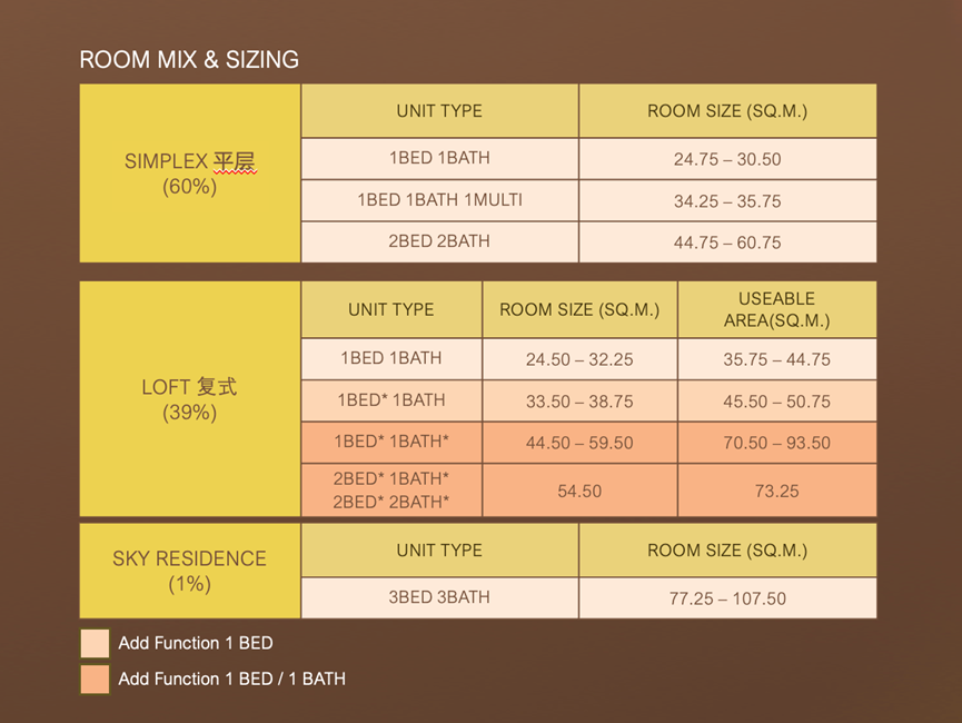 The unit mix is also comprehensive: 1-bedroom, 1+ bedroom, 2-bedroom, 3-bedroom, and some loft units, ranging from about 24 sqm to over 100 sqm.