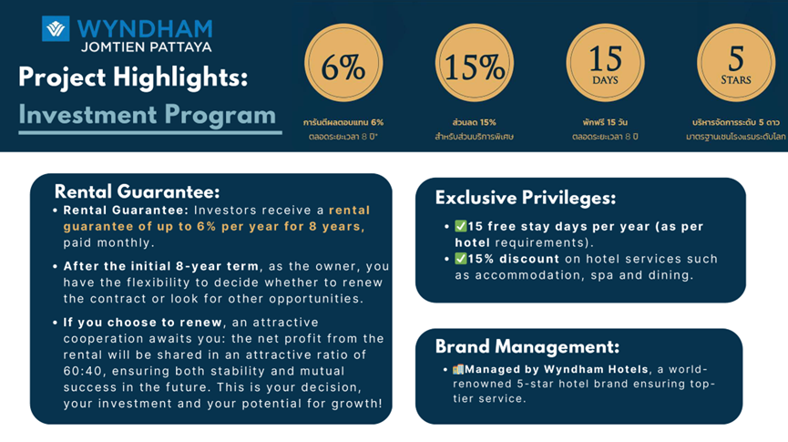 However, this level of certainty is not permanent. Owners who purchased before this year secured the full 8-year lease term. Starting next year, the remaining lease period available for new buyers will be shorter than eight years. The same project and the same units can offer very different ownership experiences and return structures depending on entry timing. For this reason, WYNDHAM Serviced Residences is seen by many as one of the few truly mature assets currently available in Pattaya—already running, already generating value, and gradually becoming rarer.