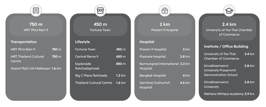 On the rail side, the project is within walking distance (approximately 750 meters) of both MRT Rama 9 Station and Thailand Cultural Centre Station. Residents are not locked into a single direction and can choose the more convenient station depending on their destination. Notably, the Cultural Centre Station will connect to the under-construction Orange Line, which is expected to significantly improve east–west connectivity across Bangkok.