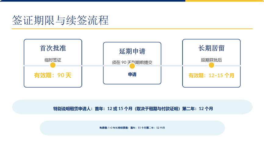 在时间结构上,这类长期居留签证并非一次性给出多年有效期,而是采取分阶段延展的方式。首次获批通常为 90 天临时签证,用于完成材料核查与延期申请。
