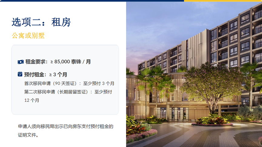 第二种方式是租房。这里的租赁并非短期居住,而是被视为一种持续性的投资行为。租赁对象可以是公寓或别墅,月租金需达到 85,000 泰铢以上。首次申请通常需要预付至少 3 个月租金,在进入长期居留阶段时,往往需提供不少于 12 个月的预付租金证明。