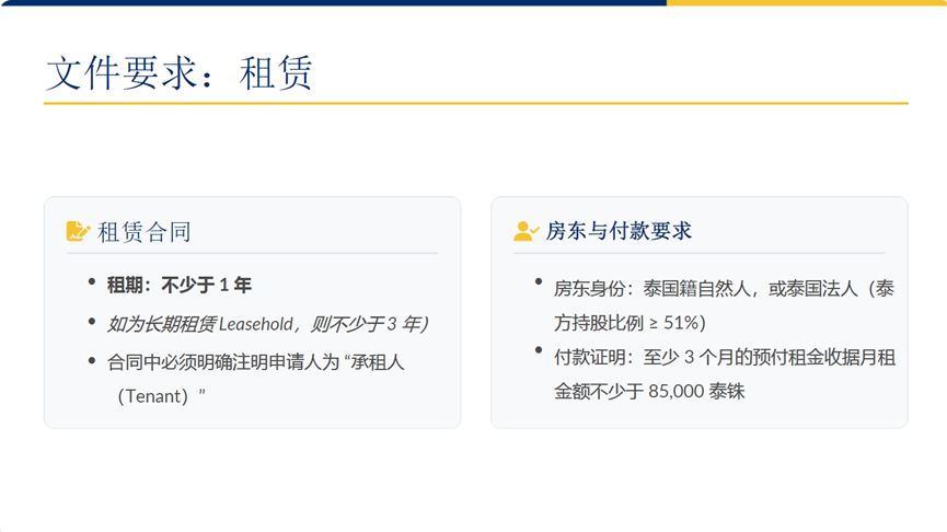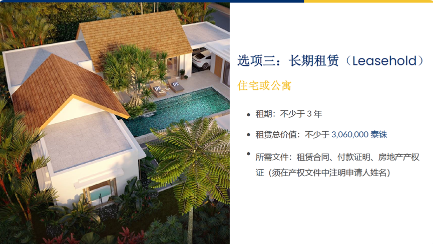第三种方式是长期租赁。该方式通常要求租期不少于 3 年,整体租赁总价值不低于 306 万泰铢,并需在产权文件中明确标注申请人信息。无论选择哪种方式,核心标准始终一致:是否形成了一笔长期、稳定、可被持续核查的房地产投资关系。