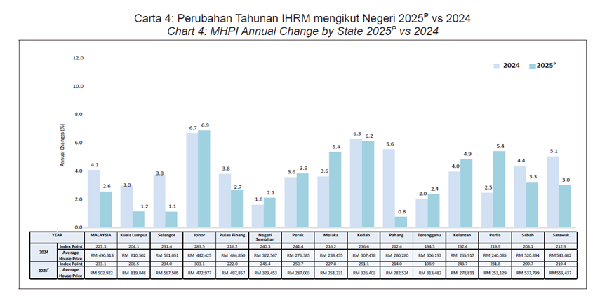 Across the country, housing prices in all states generally recorded positive growth in 2025, ranging roughly from 0.8% to 6.9%. This indicates that Malaysia’s property market did not experience widespread regional declines; instead, it showed moderate nationwide growth with structural differences between states.
