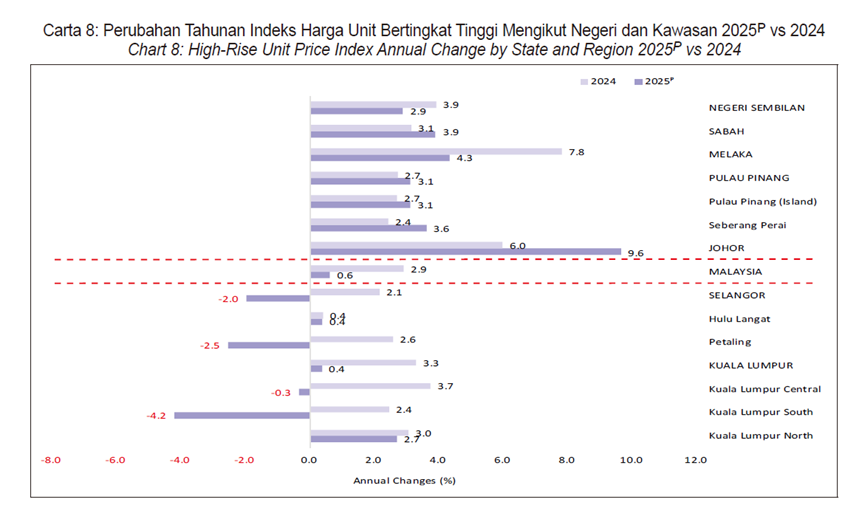 相比之下,高层住宅(High-rise Units) 的整体涨幅明显放缓,2025年仅上涨 0.6%。不过,这一趋势在不同城市之间存在差异。例如在吉隆坡核心区域,高层住宅仍上涨 3.7%。由于土地资源有限以及人口密度较高,高层公寓依然是城市住宅供应的主要形式,同时也是租赁市场最活跃的房地产产品。
