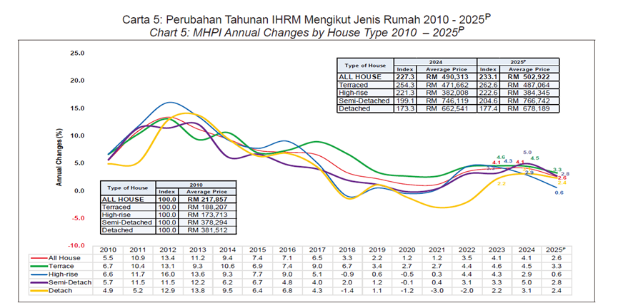 从住宅类型来看,2025年不同房型的价格走势也出现明显差异。其中,排屋(Terrace House) 成为涨幅最高的住宅类型,全年上涨 3.3%,同时也是推动房价指数上升的重要因素之一。